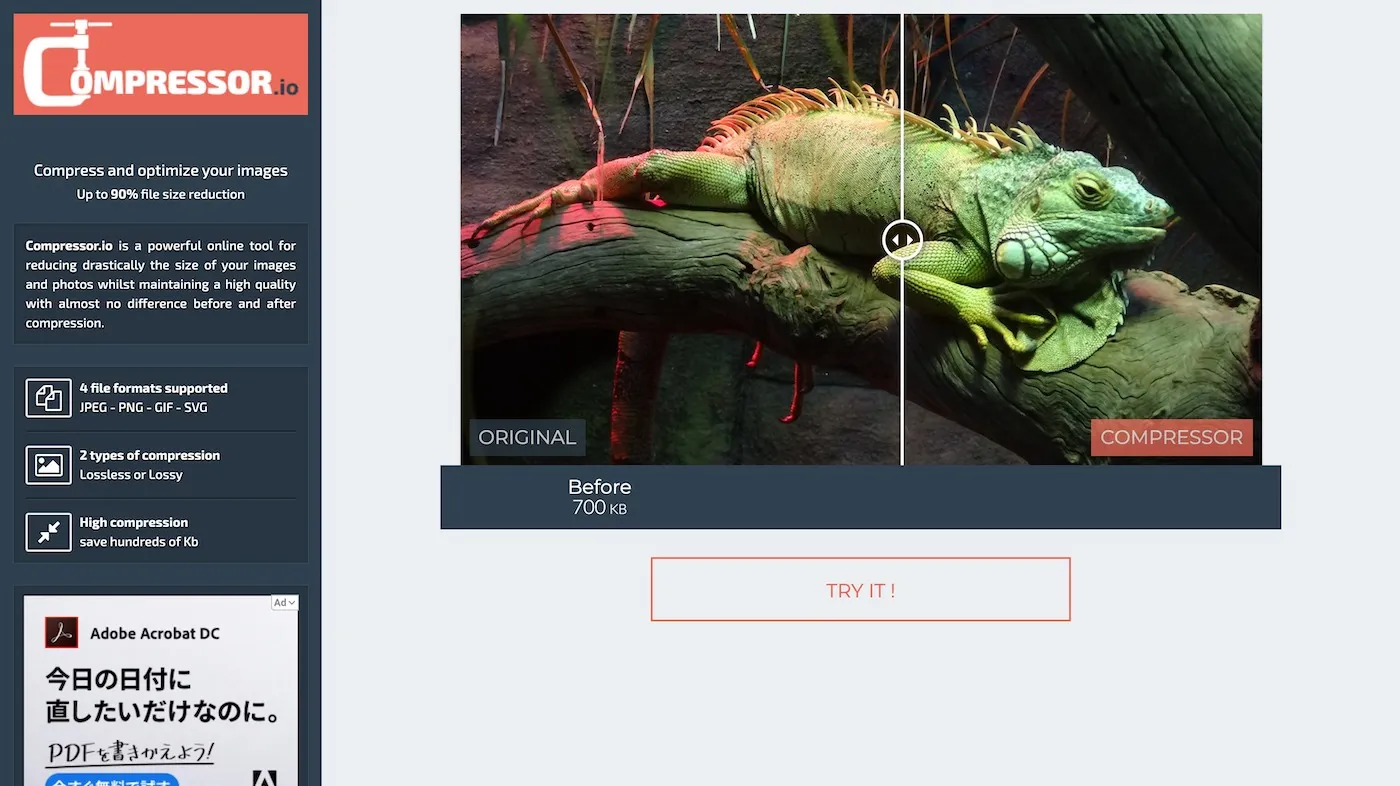 TinyPNGが5MBまでなのに対し、こちらは10MBまで対応しているので、大きめのヒーローイメージなどの圧縮に使えます。1枚ずつの処理なので、普段はTinyPNG、重い画像だけCompressor.ioという使い分けがおすすめです。