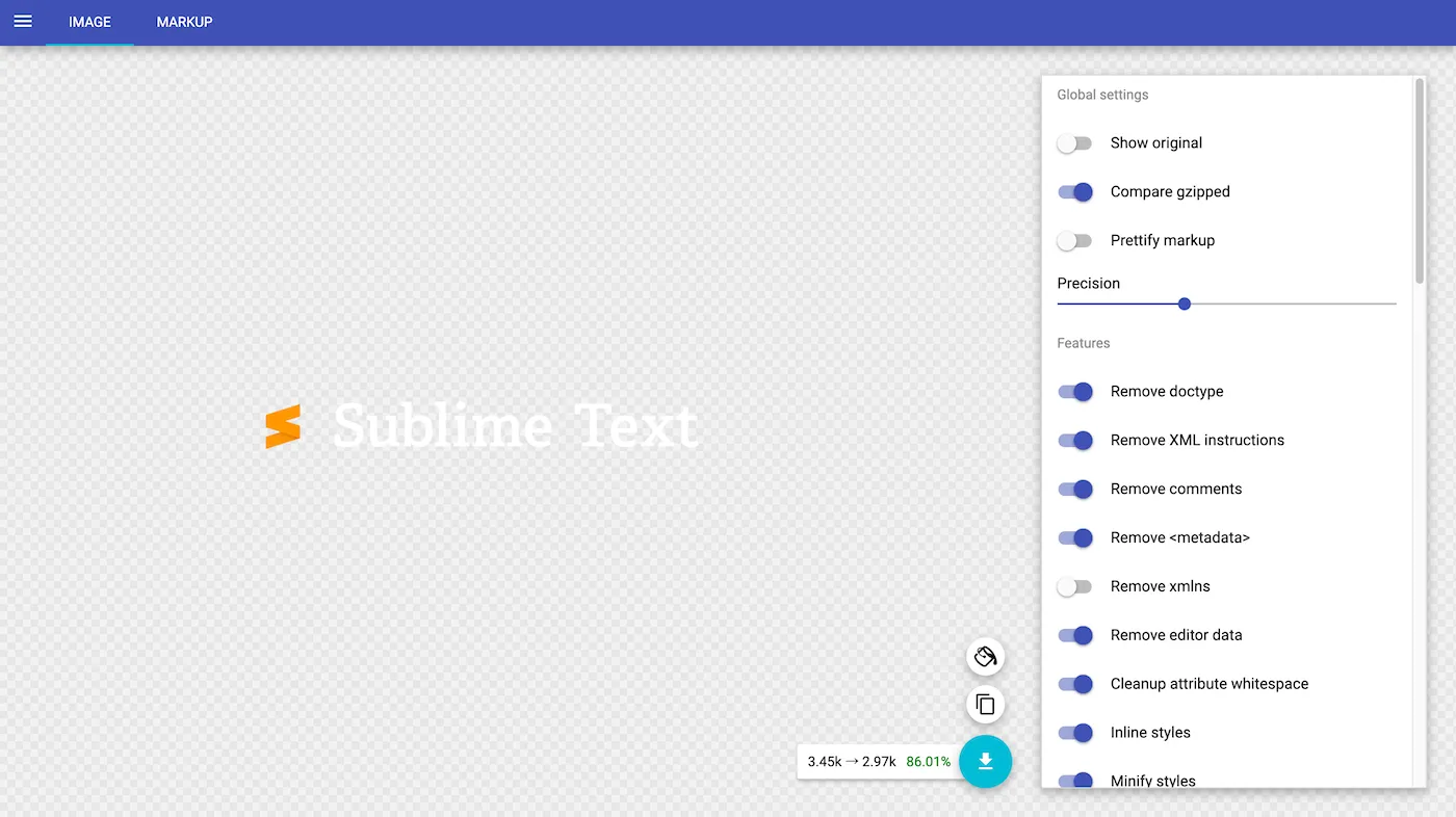SVG専用の最適化サービス。内部でSVGOが動作していて、不要なメタデータやエディタ固有の情報を削除し、すっきりしたSVGに変換してくれます。